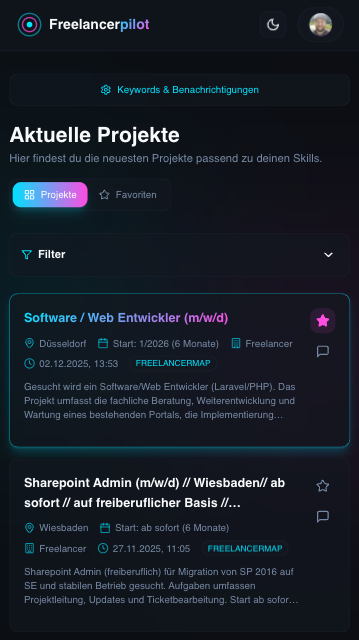 Verpasse nie wieder das perfekte Projekt. Freelancerpilot scannt den Markt in Echtzeit und benachrichtigt dich sofort bei neuen Matches.